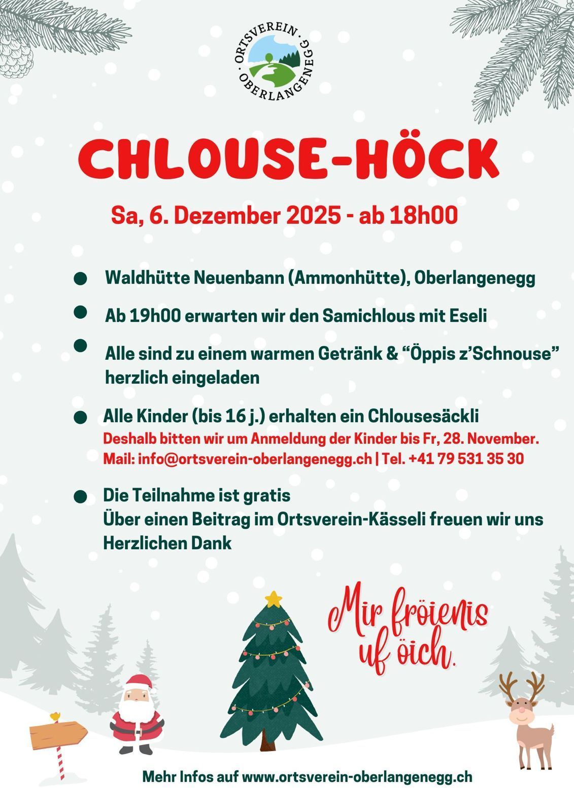 Dr CHLOUSE-HÖCK vom OVO Ho ho ho! Der „Chlouse-Höck“ geht in die zweite Runde: Am Freitag, 6. Dezember 2024 findet ab 18.00 Uhr bei der Waldhütte Neuenbann (Ammonhütte) der zweite „CHLOUSE-HÖCK“ statt. Dr CHLOUSE-HÖCK vom OVO Ho ho ho! Der „Chlouse-Höck“ geht in die zweite Runde: Am Freitag, 6. Dezember 2024 findet ab 18.00 Uhr bei der Waldhütte Neuenbann (Ammonhütte) der zweite „CHLOUSE-HÖCK“ statt. Es sind alle herzlich zu einem warmen Getränk und zu „Öppis z’Schnouse“ eingeladen. Ab 19.00 Uhr erwarten wir den Samichlous mit Eseli. Er bringt für alle Kinder ein Chlousesäckli mit. Wir bitten deshalb um Anmeldung der Kinder (bis 16j.) bis und mit Montag, 25. November bei Anita Wyttenbach (Tel. 078 641 91 54 oder Mail: ortsverein.oberlangenegg@gmail.com ) Die Teilnahme ist für alle gratis. Der Ortsverein erlaubt sich ein Kässeli für einen individuellen Unkostenbeitrag aufzustellen. Die Kosten für den Besuch des Samichlous und für die Chlousesäckli der Kinder werden vom Kiwanis Club Thunersee übernommen. Hinweis zur Anreise: Die Waldhütte steht mitten im Wald auf 980m. Wir empfehlen den öffentlichen Parkplatz beim Schützenhaus Wolfrichti zu benützen. Von dort aus führt ein Fussweg in knapp 10 Minuten direkt zur Neuenbann-Hütte. Bei wirklich schlechter Witterung, behalten wir uns vor den CHLOUSE-HÖCK beim Schützenhaus Wolfrichti durchzuführen. Wir freuen uns auf Euch! Bis denn OVO – Ortsverein Oberlangenegg.